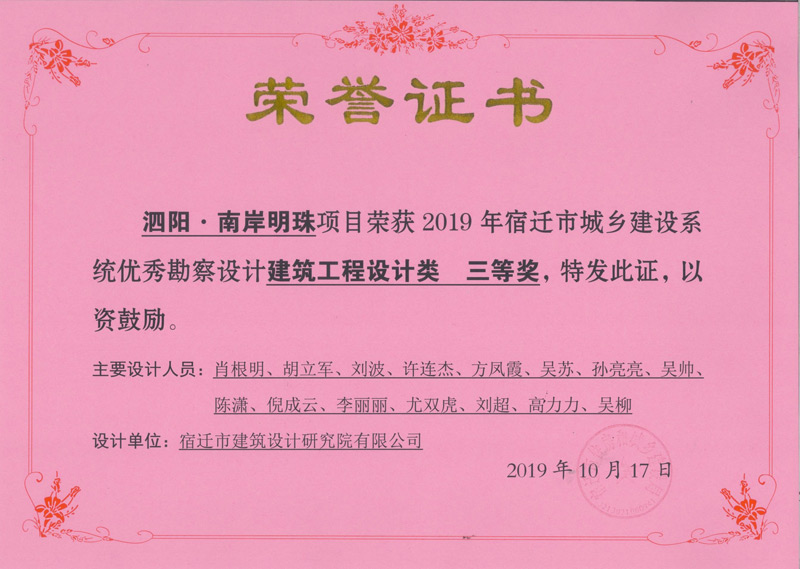 1、泗陽 南岸明珠 榮獲建筑工程設(shè)計(jì)類 三等獎